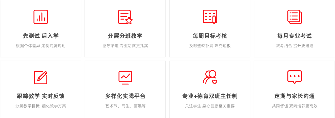促孩子进步。学校还将定期组织写生、画展等校园活动,开阔学生视野,全面提升专业水平。
